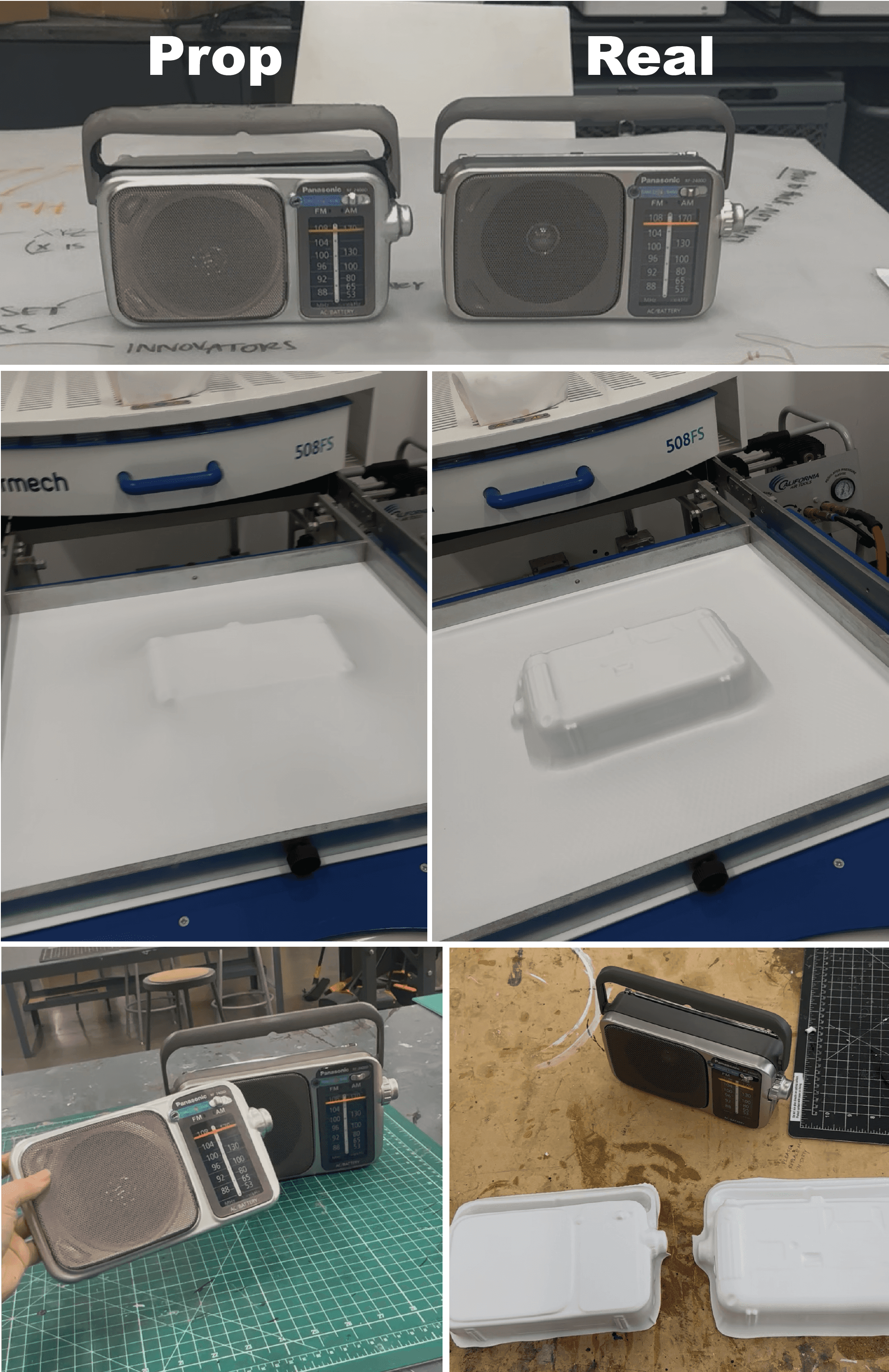 Designed props including a prop radio that breaks apart on stage.