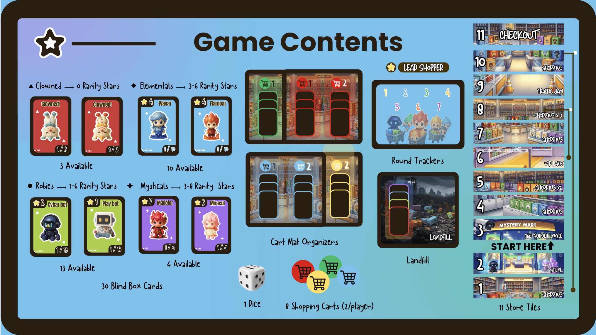 Players push carts through store aisles collecting blind-box character cards with different rarity tiers. While players can see the category or color of a box, they do not know the exact rarity value of the card until checkout, creating anticipation and risk as they collect items. The game was playtested twice and iterated based on player behavior, leading to rule changes that increased suspense, chance, and strategic decision-making.